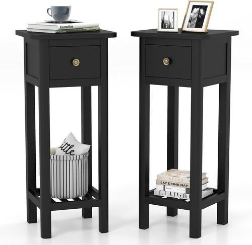 2-Tier Narrow Side Table with Drawer, Acacia Wood Tall End...