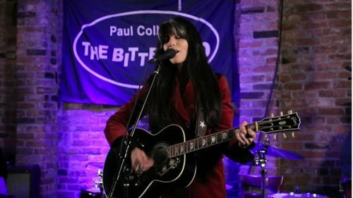 Lily Allen sports a strapless cut-out mini dress to perform...