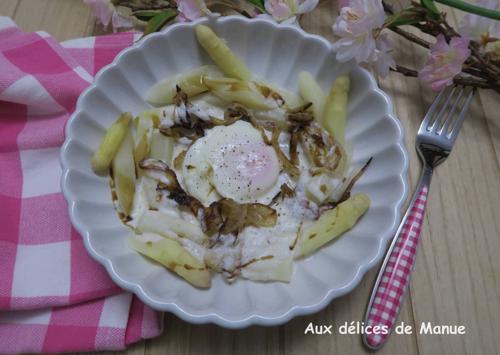 Œuf poché aux asperges en émulsion de parmesan, oignons doux...