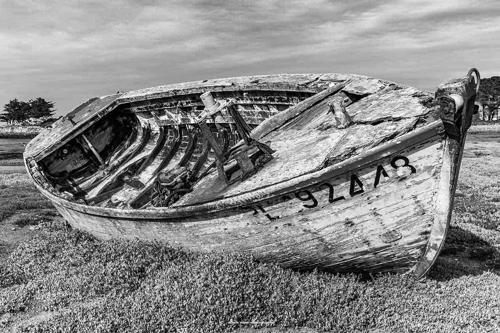 Epave d'un bateau de pêche à l'île de Bréhat, noir et blanc