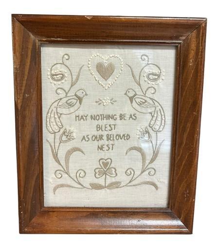 Vintage Needlework Bless Our Beloved Nest Framed Crewel 10x12