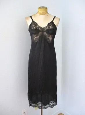 Vtg 50s 60s black nylon full dress slip butterfly sheer lace...