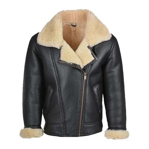 Men's Asymmetrical Style B3 Black Leather Shearling Jacket