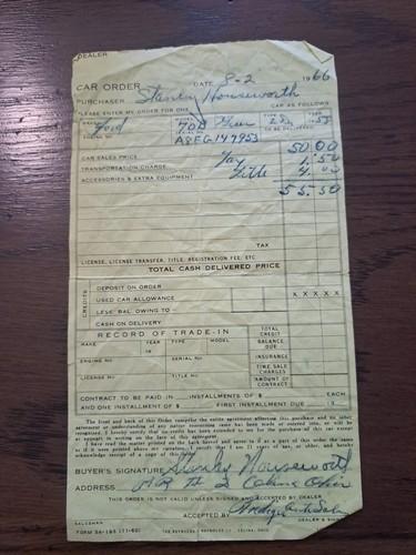 Vintage 1966 Dealer Car Order/sale Slip For A 1958 Ford Edsel...