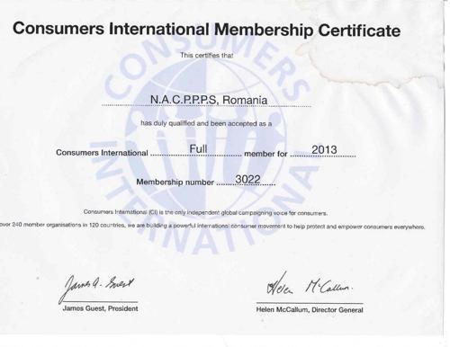 Certificat de membru - Consumers International 2013 - InfoCons