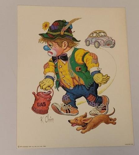 1974 VTG K Chin Clown Litho Out Of Gas Car Dog Sad Clown Donald...