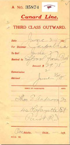 RMS CARPATHIA, THIRD CLASS TICKET STUB RECEIPT FROM 1905...
