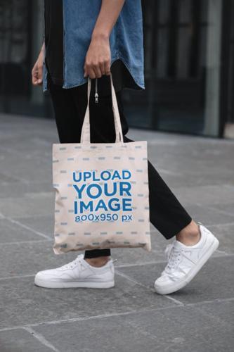 Placeit - Cropped Face Mockup of a Man Holding a Tote Bag in...