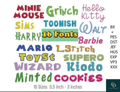 MACHINE EMBROIDERY FONTS - 16 CARTOON POPULAR EMBROIDERY FONTS...