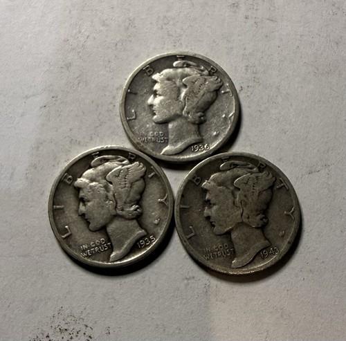 (3) Mercury Silver Dimes – 90% Silver – 1935, 1936, 1943 – Lot...