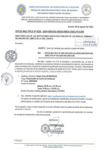 OFICIO MÚLTIPLE Nº 0228 – 2024-GRA/GG-GRDS-DREA-UGELHTA-DIR