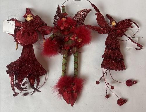 Lot 3 Pixies Elves Fairies Christmas Ornaments Red Glittery...
