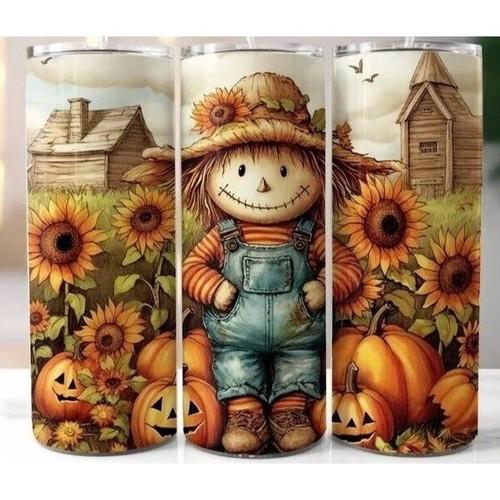 Fall Pumpkin Scarecrow Sunflower 20oz Skinny Tumbler Travel Cup...