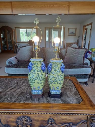 Vintage Chinese Ceramic Lamp Satsuma Famille Rose Wooden Base