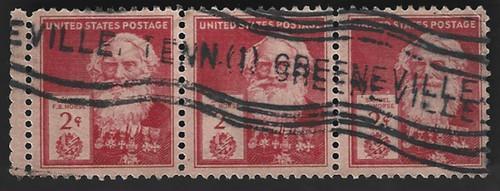 Sc#890 2c S. Morse Famous American H. Strip of 3 GREENVILLE...