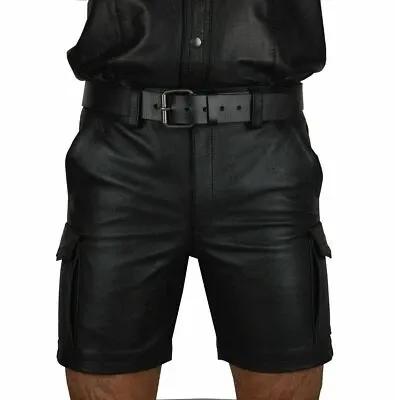 MEN'S REAL BLACK LEATHER CARGO SHORT WITH BELTED FETISH CLUB...