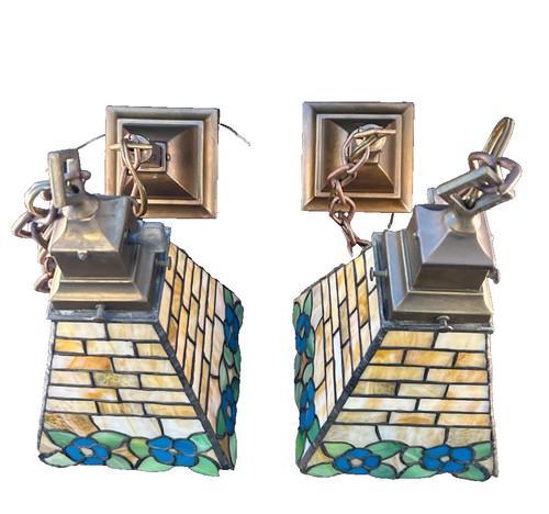 pair of 1910-20s brass pendant fixtures , stained glass shades