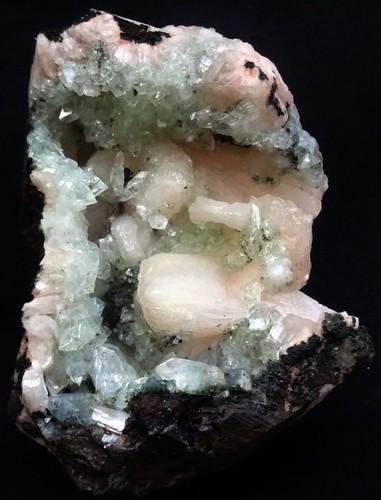 GREEN APOPHYLLITE CRYSTALS W/ STILBITE BOWS IN SEMI GEODE...