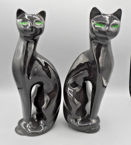 Set of 2 Black Siamese Cat Statue With Green Eyes Made in...