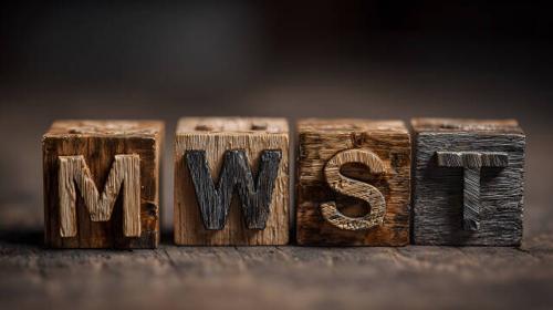 Mehrwertsteuer Kürzel MWST aus Holz auf dunklem Hintergrund –...