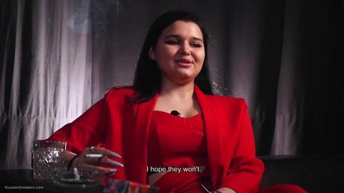 Lady in red Nastya is smoking and giving an interview Russian...