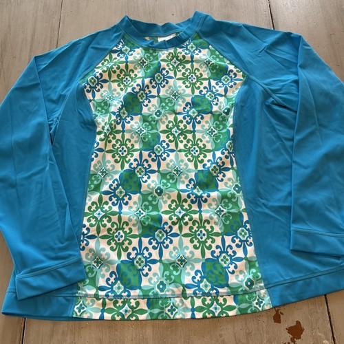 Lands End Blue Green White Medallion Print Long Sleeve Rash...