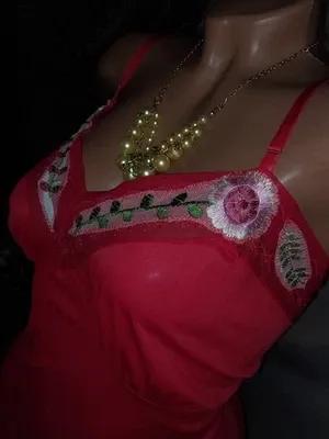 VTG SILKY TRICOT NYLON RED EMBRD FLORAL APLQ GOLD LEAFS DRESS...