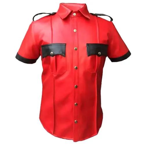 Red Leather Police Officer Shirt | Men's Two-Tone Fetish Top