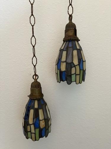 Vintage Pair Tiffany Style Pendant Light Fixtures Hanging Lamps...