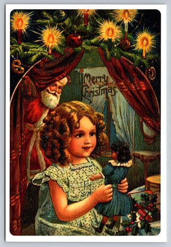 Postcard New Retro Style Little Girl Finds Doll Christmas Tree...