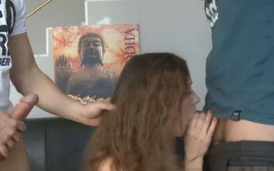 Vriendin met twee mannen in trio sex