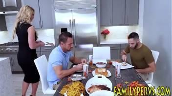 Stepmom in the kitchen helps stepson with his boner...