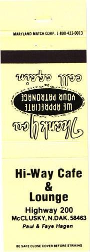 McClusky North Dakota Hi-Way Cafe & Lounge Vintage Matchbook...