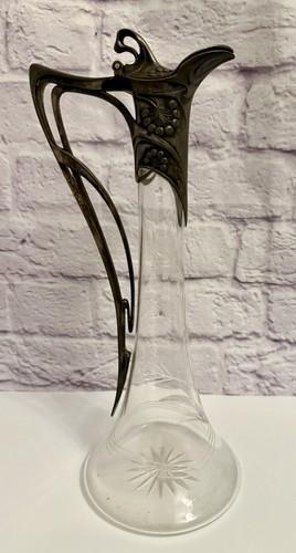 Antique Art Nouveau Claret Jug Glass Decanter w/ Metal Overlay...