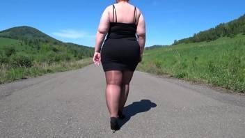 Mature BBW in nylon pantyhose and high heels walks down the...