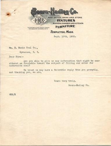 1920 Bourn-Hadley Co. Typed Letterhead Templeton MA Coal Order...