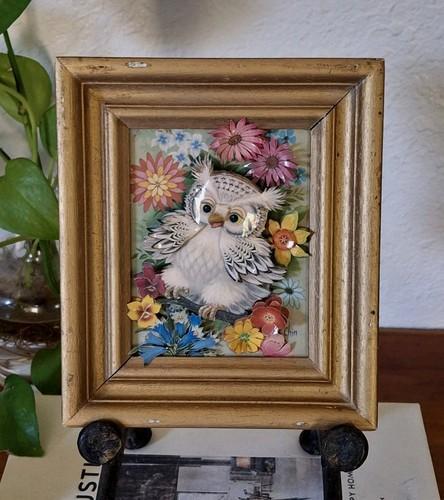 Vintage K Chin Owl Floral 3D Framed Print 70s Rare Kitsch...