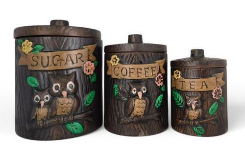 Vintage Owls on Branch Wood Grain Lot of 3 Sugar Coffee Tea...