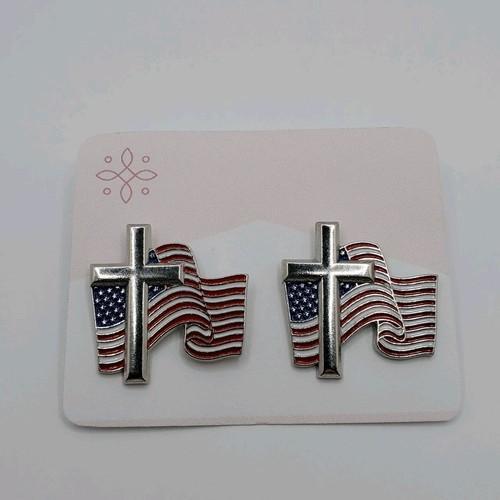 Christian Cross US American Flag Lapel Pin Set Patriot...