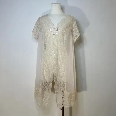 50s 60s Light Pink Peignoir Lace Ribbon Soft Girl Coquette...