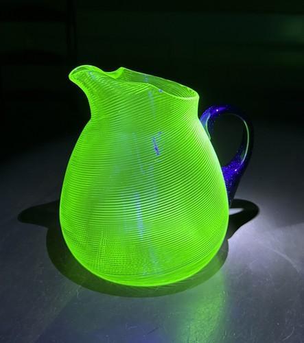 Antique Steuben Glass Green w/ Black Handle Uranium Pitcher 8”...