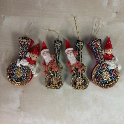 VTG Lot Of 4 Santa Pixie Elf Flocked Guitar Christmas Ornaments...