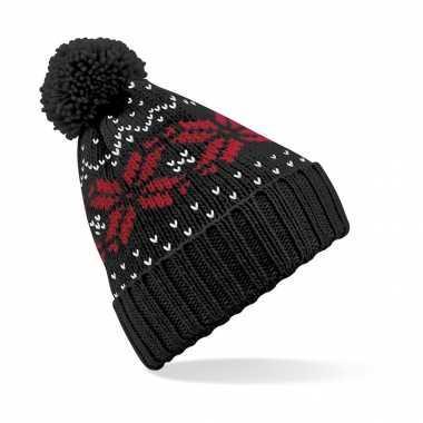 Gebreide nordic wintermuts met pom pom zwart/rood...