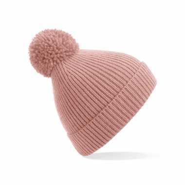 Gebreide wintermuts met pom pom roze | Wintermuts-kopen.nl