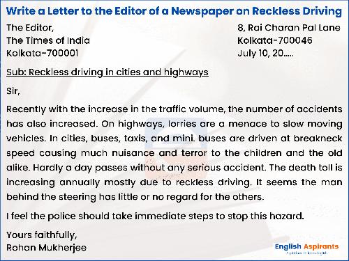 Letter to the Editor of a Newspaper on Reckless Driving [2025]