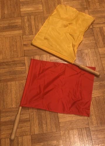 Two Vintage Referee Flags Red & Golden Yellow On Wooden Poles