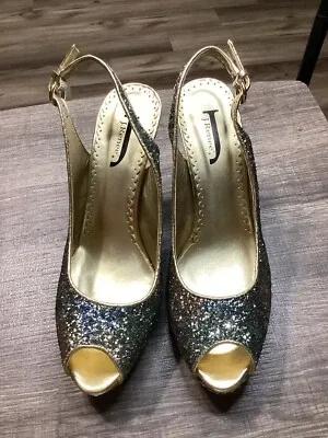 J. Renee Blue & Silver Glitter Open Gold Toe Heels Sz 10 M...
