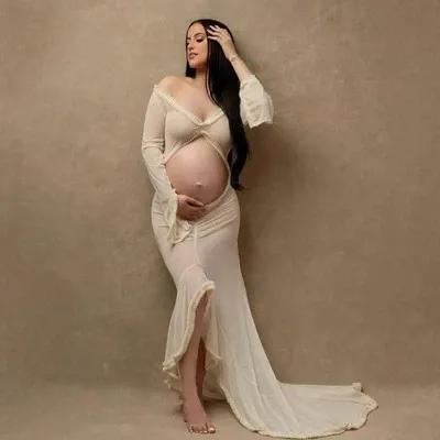Maternity Sheer Lace Ruffle Dress Long Sleeve Sexy Slit...