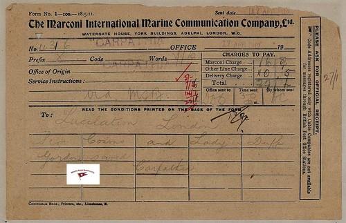 RMS CARPATHIA MARCONIGRAM- COSMO & LADY DUFF GORDON SAVED 1912 RP