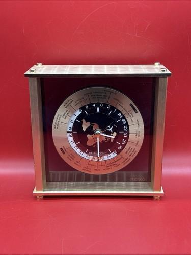 Seiko Quartz World Time Desk Clock Brass Glass Case Rotating...